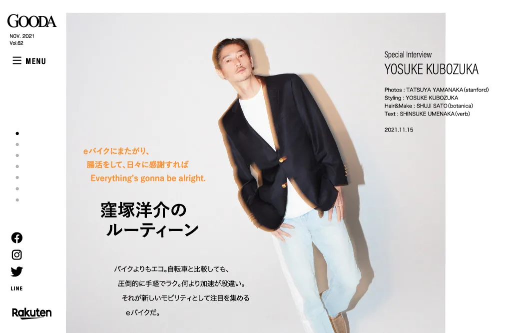 手にするだけで毎日ちょっとハッピーな気持ちになれる。そんなとっておきを紹介している「GOODA」。eバイクを特集した今号の表紙には、2017年にマーティン・スコセッシの監督作「Silence-沈黙-」でハリウッドデビューを果たし、2020年にはBBCとNetflixの共同制作シリーズ「Giri/Haji」にも出演している俳優・窪塚洋介さんが登場します。「艶」「アーバン」「モノトーン」という3つのお題をもとに窪塚洋介さん本人が、私服を使ってスタイリングしたファッションページは、茶目っ気と大人の色気が共存する上質なコーディネイトで、窪塚ワールド全開といった仕上がりに。窪塚洋介がいま着たい秋冬コーデというべきスタイリングは必見です。インタビューでは、今号の特集であるeバイクについて、自身を含め息子も乗っていることや、最近ハマっているという“腸活”では1日1.5食を摂ることを心がけていることを話してくれた。また、舞い込む多くのオファーから、どうやって出演作を選んでいるのか?という質問に対しては「胸のドキドキが基準です。20数年、俳優をやってきているので、引き受けて後悔しないか、何となくわかるんですよ」と、キャリアを積むことで、勘が働くようになっていることなどを話してくれた。