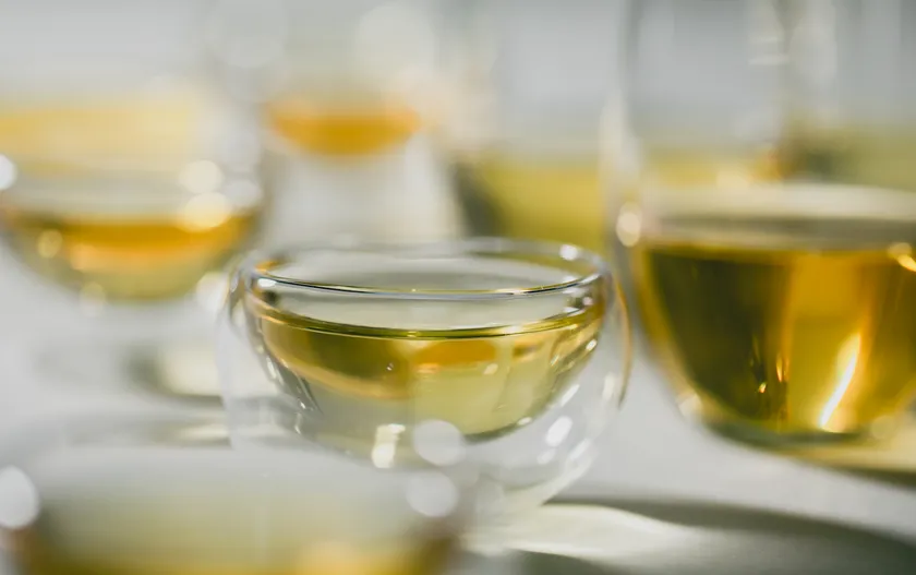 氷や冷蔵庫で冷やしてグラスに注ぐと透き通った黄金色に。フレッシュなブドウを思わせるすっきりとした味わいからのどを通った後はワインでいうとタンニンのような口当たりもほんのり感じられます。鼻から抜ける香りや後味をワインのようにじっくりと味わってみてください。