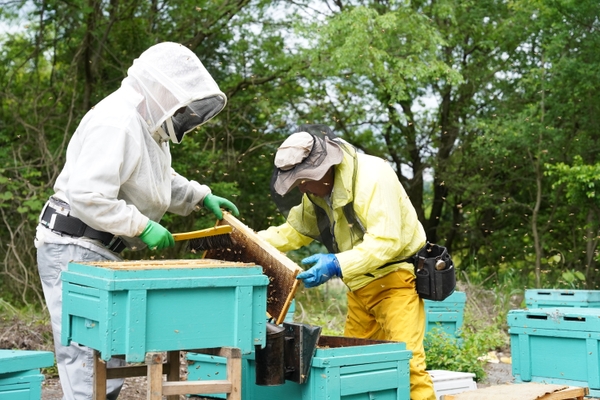 金市商店では、蜂蜜の買い付けを社長である、ハニーハンターの市川拓三郎がすべて行っております。春になり、ミツバチが活動し始めると、南は鹿児島から、北は北海道まで全国各地にいる養蜂家を訪ねます。そして、現地で蜂蜜を実際に目で見て、匂いと味わいなどをチェックし、納得する品質の蜂蜜だけを買い付けます。時には一緒に採蜜作業を行った蜂蜜をそのまま買い付けることもあります。そして蜂蜜をできるだけ早く、京都の工場に送り、瓶詰してお客様にお届けします。その採れたてのフレッシュな蜂蜜を、金市商店では「新蜜」としてお客様に提供しております。