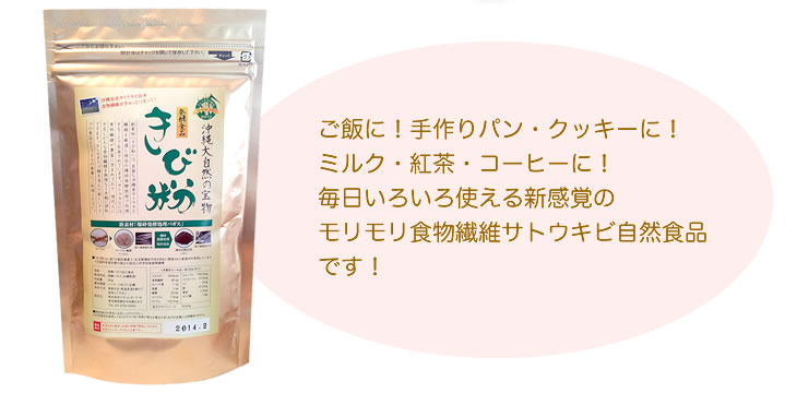 サトウキビの圧搾かすである「バガス」を独自の特許技術で爆砕、発酵し、厳重な品質管理のもとで製造された新しい健康食品で、食物繊維を豊富に含んでいます。『きび粉』は特許技術でもある爆砕発酵処理で繊維をさらに柔らかくしてあるため、100gあたり53.7gもの食物繊維が入っています。お家で簡単に繊維生活をおくることができます。『きび粉』は、沖縄原産のサトウキビを元に国の委託事業で開発された新素材を使用しています。安全性・有効性が臨床試験で立証された素材です。厳重な品質管理のもとで製造されているため、TV・雑誌・新聞などのメディアでも注目されています。(残留農薬分析一般生菌、大腸菌検査など)