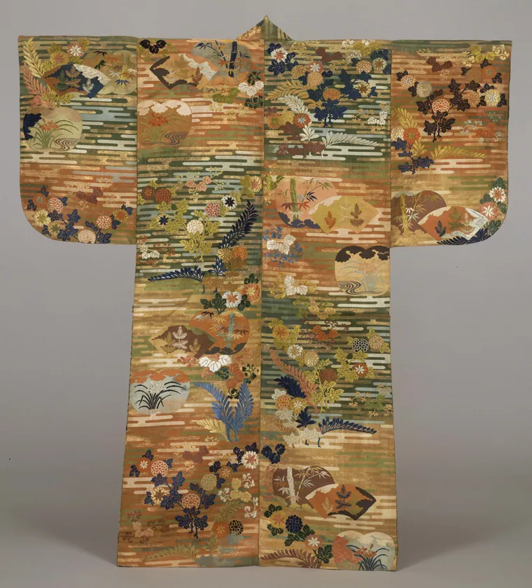 末広がりの扇形や、竹や若松など、吉祥の模様が散りばめられた能装束です