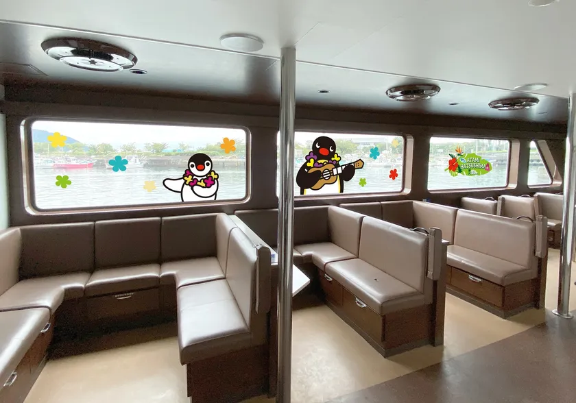 熱海港と離島リゾート「初島」を約30分間で結ぶ定期船「イルドバカンス三世号」と「イルドバカンスプレミア号」がピングーの世界観たっぷりにデコレーションされ、「ピングー号」として運航いたします。ピングーやなかまたちと一緒に優雅な船旅をお楽しみいただけます。