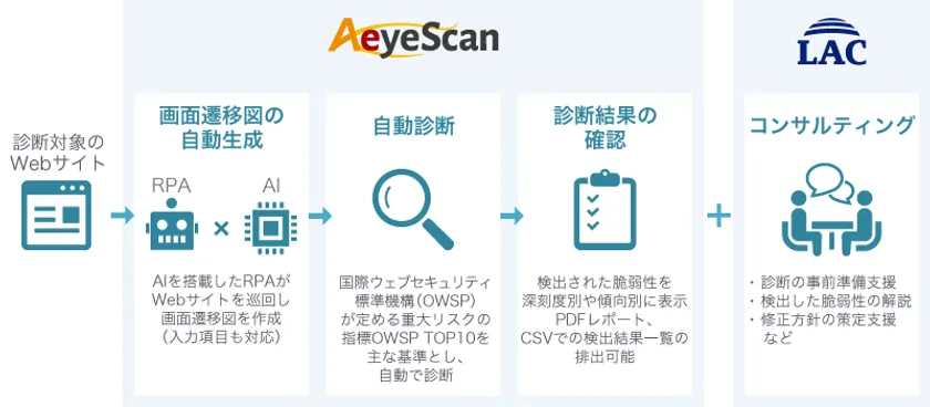 株式会社ラック(本社:東京都千代田区、代表取締役社長:西本 逸郎、以下 ラック)と株式会社エーアイセキュリティラボ(本社:東京都江東区、代表取締役社長:青木 歩、以下 Aeye)は、本年4月23日に発表した新しいセキュリティ診断モデルの構築に関する提携に基づき、Aeyeが提供する、Webサイトの脆弱性診断業務を自動化するRPA(ロボティック・プロセス・オートメーション)と人工知能(AI)を使ったSaaS型Web診断プラットフォーム「AeyeScan」と、ラックの診断エキスパートによるコンサルティングを組み合わせ、Webサイトの安全運用とセキュリティ診断内製化を実現する「Quick WATCH」サービスを2021年11月18より提供開始します。