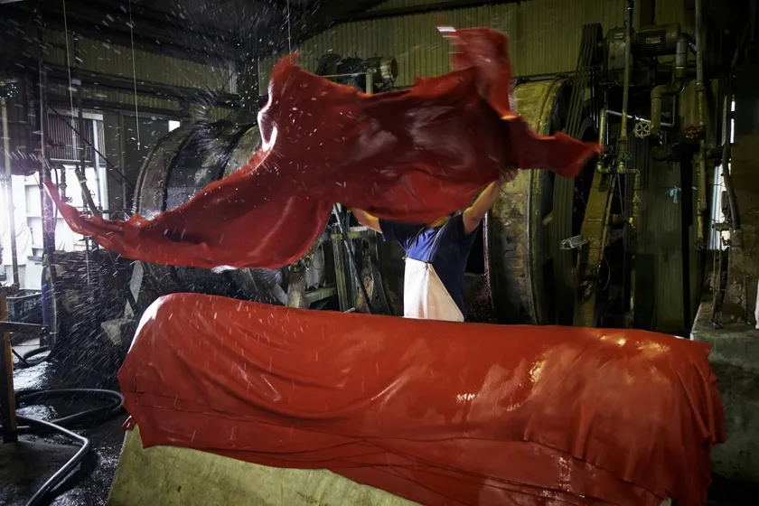 レッザボタニカ(R)は大正12年からの歴史を誇る革商社「富田興業」が独自開発した牛皮(食の副産物)とポマース(搾りかす:植物由来の副産物)を廃棄せずアップサイクルさせたサステナブル(持続可能)レザー。「レッザボタニカ・ビーノ」はワイン醸造精製中に生じたワインポマースを牛革の鞣し・染色に使ったレザーです。