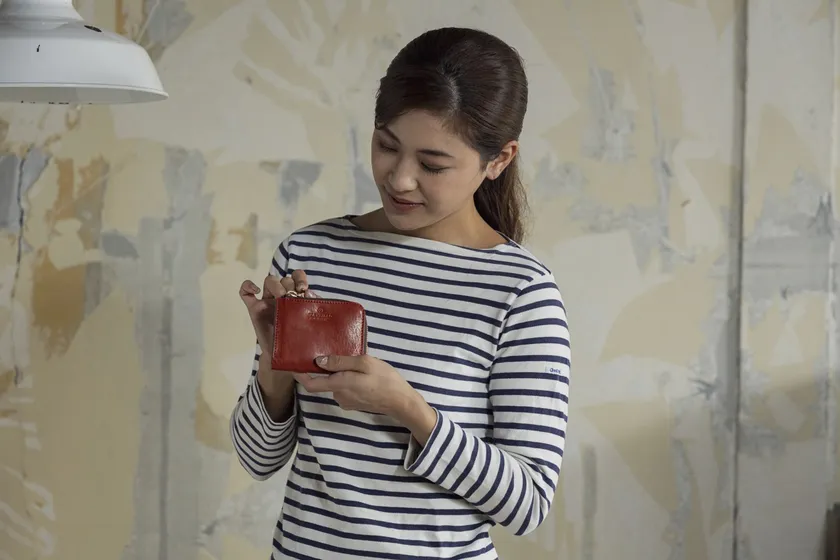 L字型のミニマムな形状ながら、4つのカードポケットとコインポケット、札入れ機能を搭載。ファスナー引手はベルトループやバッグに掛けられるフック型に。