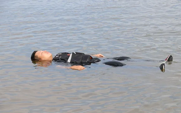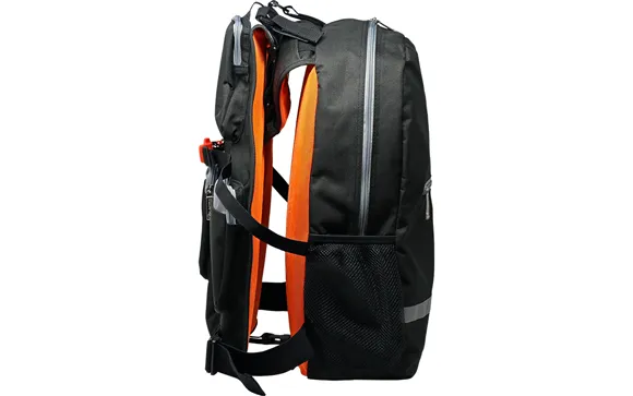 ライフジャケット一体型リュックとして、ベスト前面とリュック背面に発泡材が入っているので、約80kgの人が5kgの荷物を背負っても簡単に水に浮くことができます。
