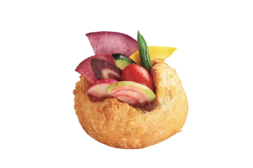 もっちり生地で道産とうきび入りカレーを包み込み、5種の道産野菜とカマンベールチーズ、ホワイトソースをのせて焼き上げました。