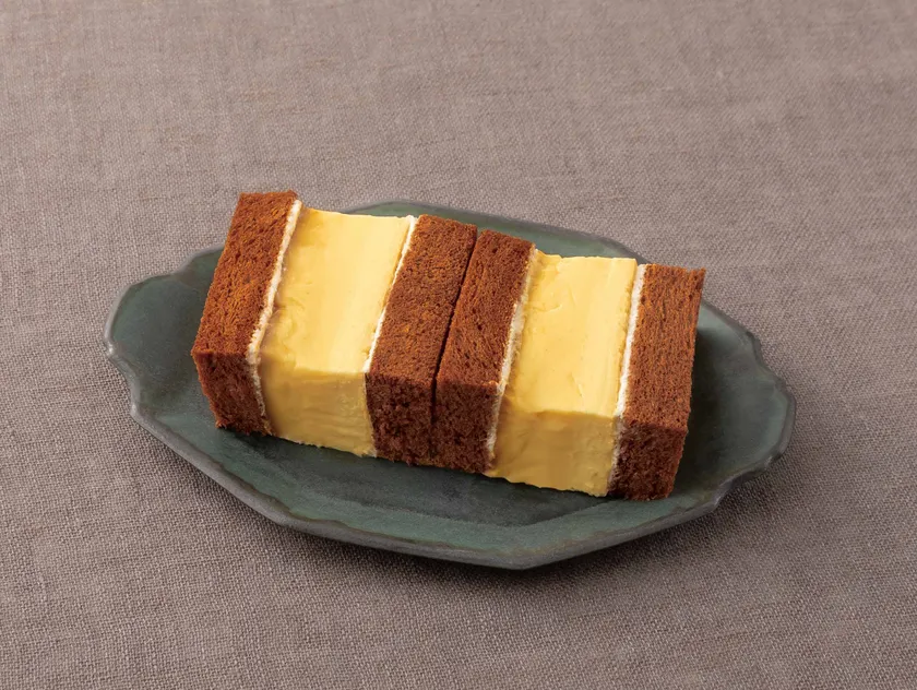 創業当時のレシピを再現したプリンに、ホイップクリーム、ほろ苦カラメルソースのサンドイッチ。プリンは堅めで昭和の懐かしい味、ふんわりとした黒パンはお店のオリジナル。