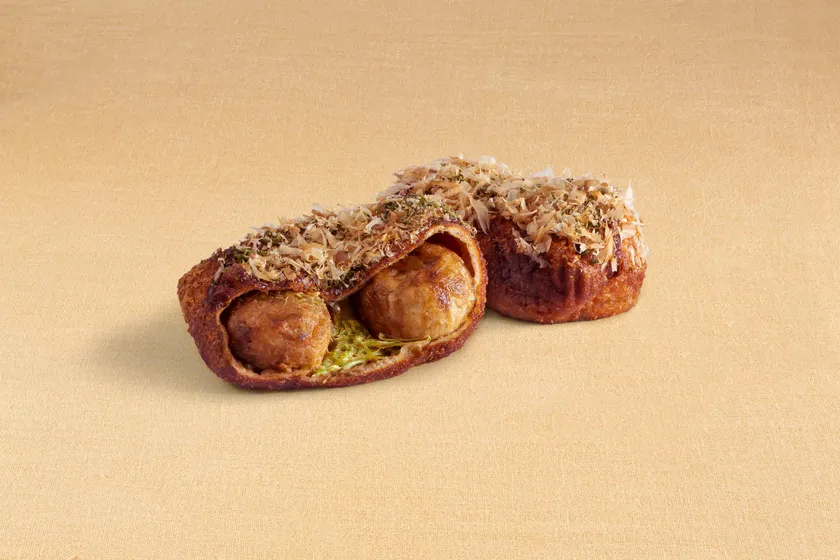 たこやきをカレーパンの生地で包んだ新食感、新感覚のたこ焼きパン。特製の鯖節の風味が食欲をそそります。