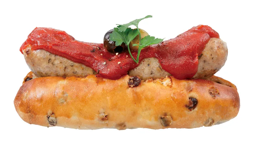2種の干しぶどうを練りこんだコッペパンに自家製のハーブチキンソーセージを挟みました。炒め玉ねぎをパンに入れているため、ソーセージによくあいます。