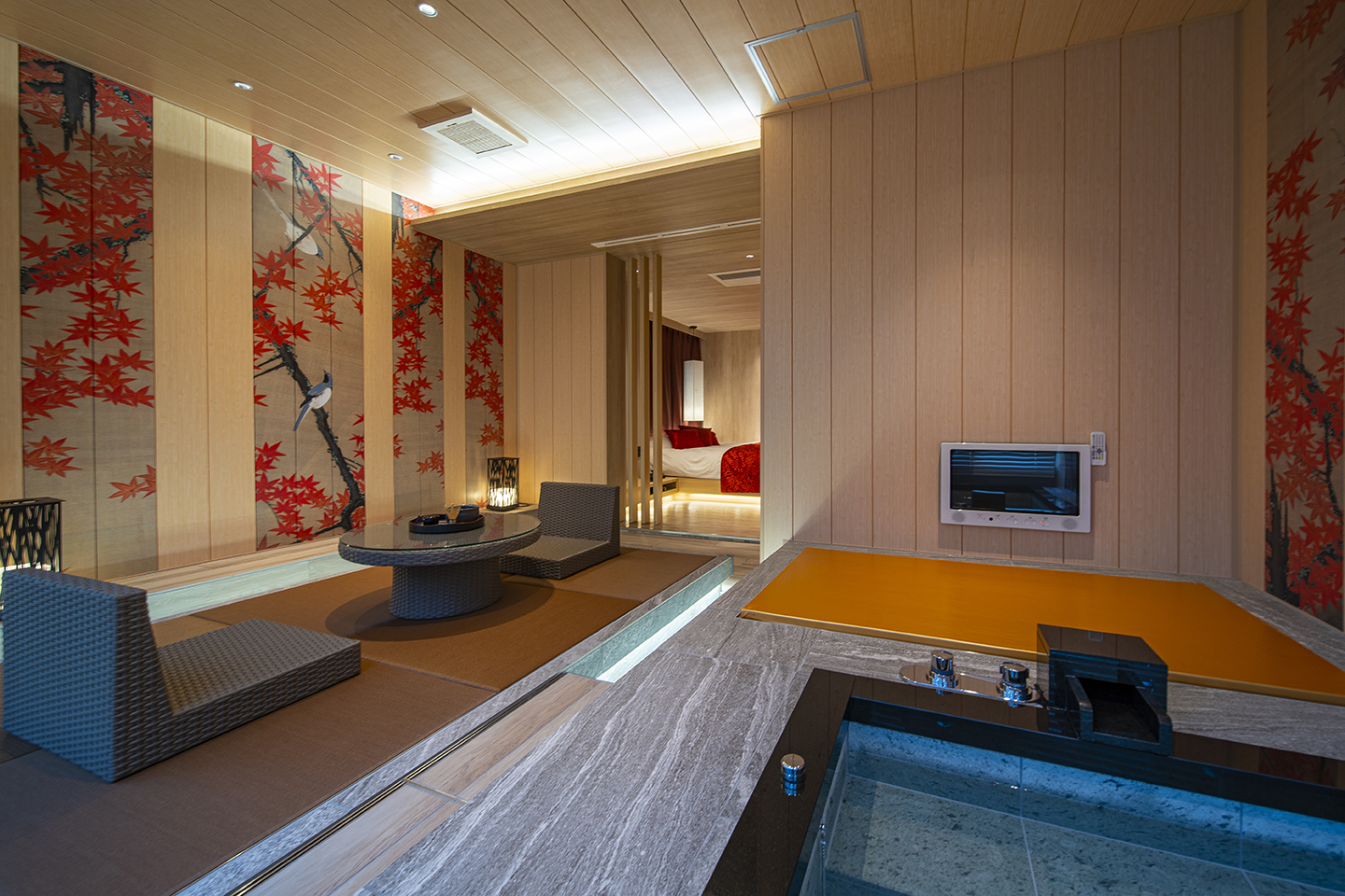 朝霧は赤を基調にした内装で豪華な石風呂が設置され、その隣には和室があり周りには水盤をあしらっております。利用料金は休憩8,980円~、宿泊15,980円~となっております。(平日)