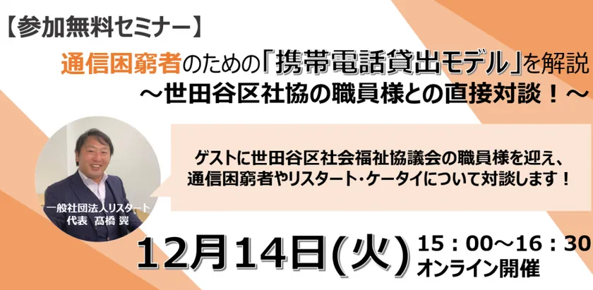 通信困窮者を携帯レンタルサービスで支援する一般社団法人リスタート(所在地:東京都豊島区池袋、代表理事:高橋 翼)は、2021年12月14日(火)に、『通信困窮者のための「携帯電話貸出モデル」を解説 ~世田谷区社協の職員様との直接対談!~』をオンライン配信で開催いたします。このセミナーは前回10月の実施時に好評の内容で、前回は困窮者支援を行う全国の自治体窓口および地域の社会福祉協議会の職員ら23人が参加しました。全国初の事業化に成功した「携帯電話貸出モデル」について、東京都の社会福祉法人世田谷区社会福祉協議会「ぷらっとホーム世田谷」の職員さまにご登壇いただき、実際の運用状況や現場の職員様及び利用者の声をお届けできる貴重な機会となっておりますので、ぜひご参加をお待ちしております。