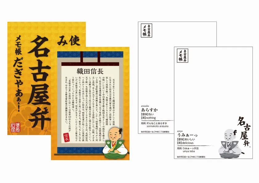 ・名古屋名物“手羽先”と、名古屋弁を紹介した“三英傑メモ帳”がコラボし、名古屋の魅力が全面に詰まっています。