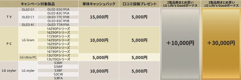 対象製品のご購入で最大15,000円、指定サイトで口コミを投稿すると追加で5,000円をキャッシュバック。さらに、対象の製品群をまとめ買いすると「LG Life's Goodボーナス」が追加され、2製品群のまとめ買いで10,000円、3製品群のまとめ買いで30,000円をプレゼント。LG Life's Goodボーナスを含めれば、最大で80,000円のキャッシュバックとなります。