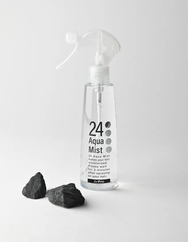 「24アクアミスト」は大学などの研究室で細胞や血液を培養する際に使われる不純物を一切取り除いた超純水に天然鉱石ブラックシリカを漬け込みイオン化したミネラル機能水に音波の波長によって活性化させたフリーエレクトロン(自由電子水)でできたヘアミストです。傷んだ髪の修復をコンセプトに、昭和薬科大学の准教授、かつ日本珪素医科学学会の理事であり未病総合治療院院長でもある小野寺敏医学博士と毛髪診断士が共同で開発しました。ベースとなる水はナノよりも小さいオングストロームサイズまで分解し、髪の内部まで浸透。髪の深部であるコルテックス毛皮質まで作用し、髪にしっかりと潤いを届け、艶とコシをよみがえらせます。