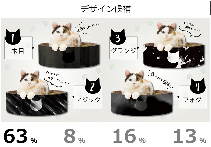 下図のような4種類のデザイン候補の中から、SNS上でアンケートを実施した結果、(1)の木目が63%のお客様から支持され、デザインを決定しての販売となります。