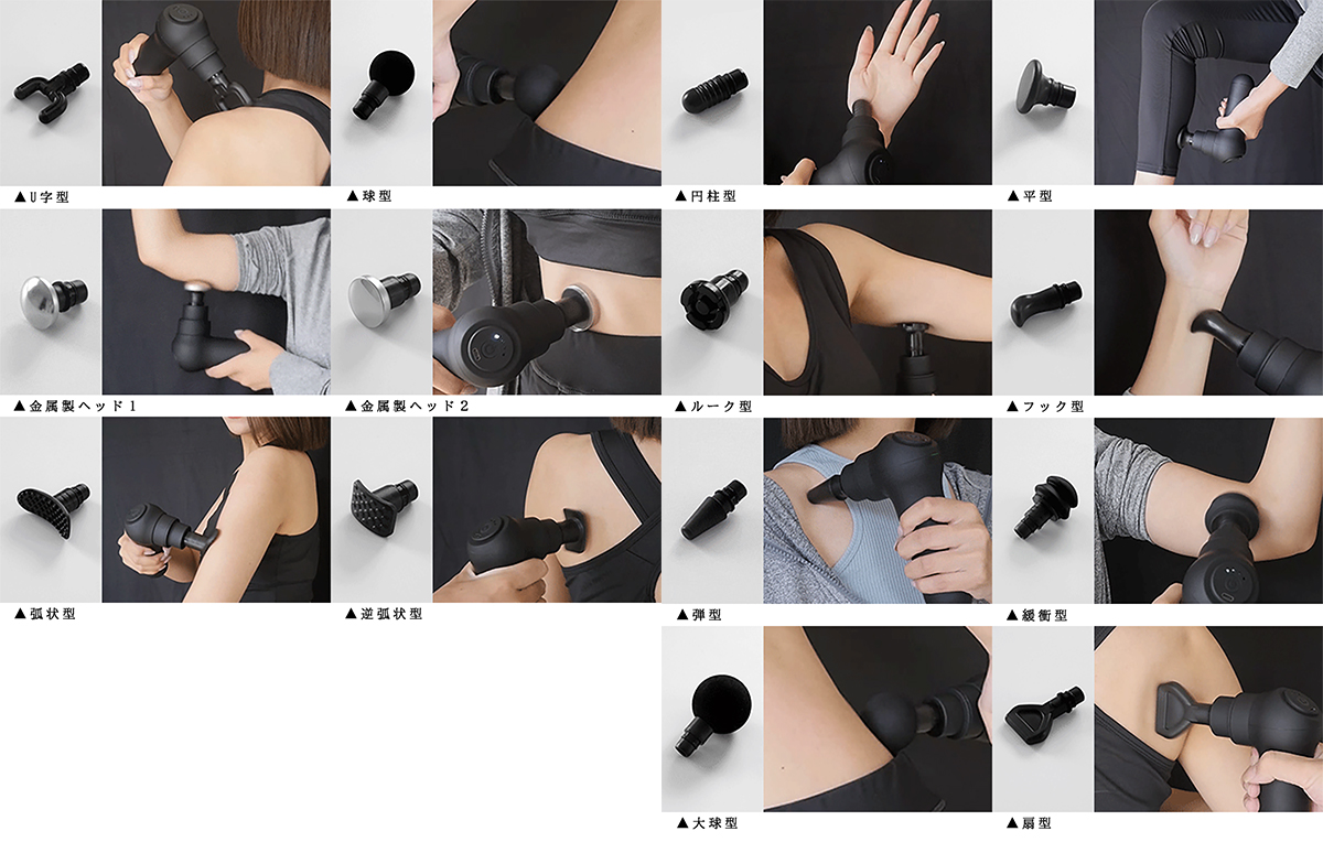 付属するアタッチメントは、定番の球型・平型・U字型・円柱型に加え、衝撃を吸収する丸型、独特なカーブが心地良い弧状型、滑らかな刺激を与える扇型、狭い面積に効果的な弾型の計14個を付属しております。