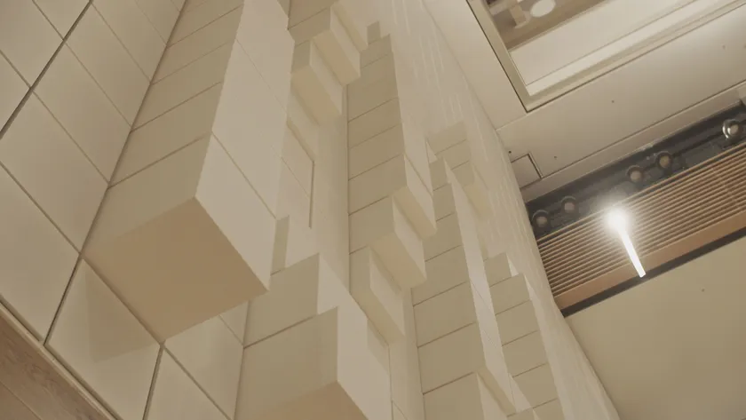2020年にリニューアルされた新宿キャンパス1階にあるアトリウム空間。高さ12.8m、幅16mの巨大スクリーンに可動キューブがうごめくキネティック・ウォール(常設 国内初※1)を備えた、多目的学園ホールです。映像・音響・照明を組み合わせた多彩な演出表現が可能です。