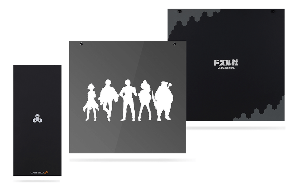 本体右と正面にドズル社ロゴ、ガラス面にメンバーシルエットをスクリーンプリント 「人生というゲームをもっと楽しく」という理念で、ゲーム実況者の枠を超えてさまざまなエンターテインメントをお届けする、ドズル社とLEVEL ∞コラボ オリジナルデザインモデル。