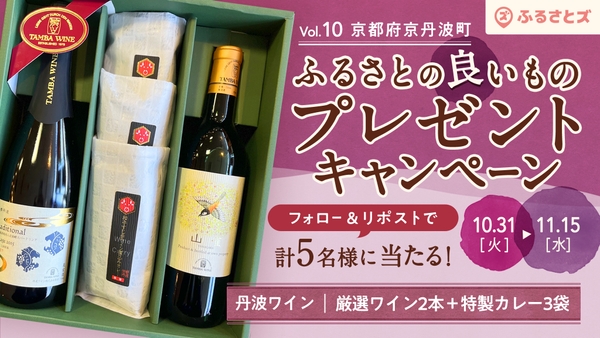 株式会社サンカクキカク(本社:福岡県久留米市、代表取締役:宇佐川桂吾)は、10月31日(火)〜 11月15日(水)の期間中、新しいふるさと納税のカタチを実現する『ふるさとズ』の取り組みの1つとして、Xプレゼントキャンペーンを開催することをお知らせします。キャンペーンにご応募いただいた方の中から、抽選で5名様に、京都府京丹波町にある「丹波ワイン」の『厳選ワインと特製カレー』をプレゼントします。