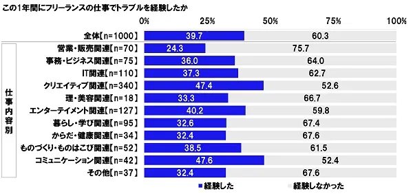 続いて、全回答者(1,000名)に、この1年間にフリーランスの仕事でトラブルを経験したか聞いたところ、「経験した」は39.7%、「経験しなかった」は60.3%となりました。契約関係の曖昧さもトラブル遭遇率の高さの一因となっているのではないでしょうか。