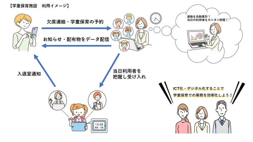 女性の社会進出や共働き世帯によって学童保育の需要も高まる中、保護者の利便性向上や職員の働き方改革としてICTを取り入れることでデジタル化を実現し、スムーズな施設運営に役立てていただいております。