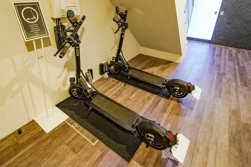 電動キックボードはオートロックの施設内の1階共用部分に設置。コンセントを使い、共用部分での充電が可能です。