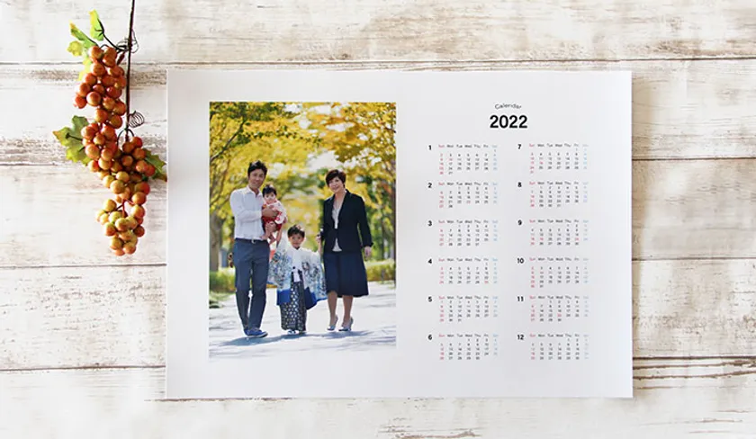 新商品『ポスターカレンダー(横)』は、PCやスマホから1年分の暦がレイアウトされたテンプレートに画像1枚を差し込むだけで簡単にA3相当サイズのポスターカレンダーが作成できます。