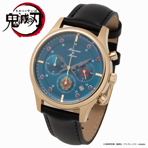 センター針は日輪刀のシルエットとなっており、隊服をイメージした深緑の盤面やケース側面には、傷跡をイメージした掘り加工を施している。