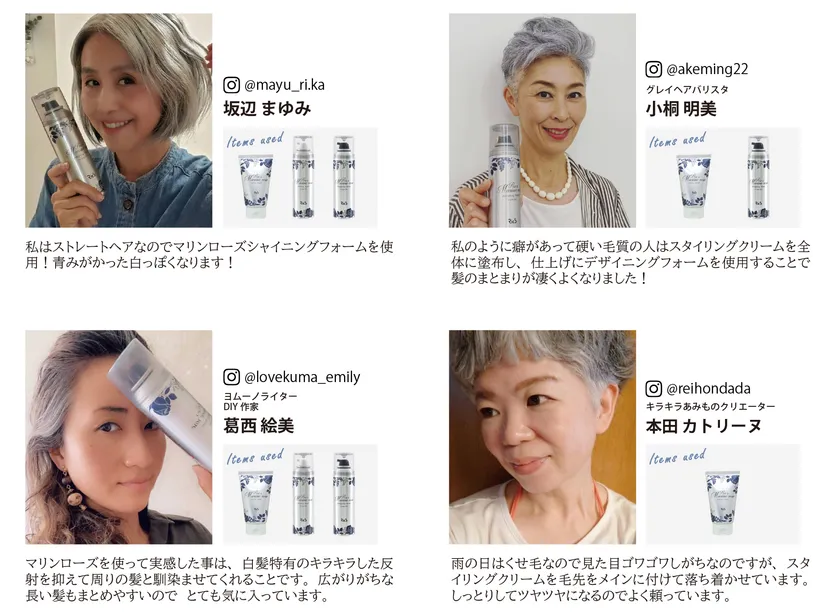 これまで当社は、グレイヘアブームの立役者である朝倉 真弓氏と開発を重ね、2019年10月よりグレイヘア専用の白髪を綺麗に見せる、新発想の染めないヘアスタイリング剤を開発し、2021年6月にはヘアケアシリーズを新たにリリースいたしました。