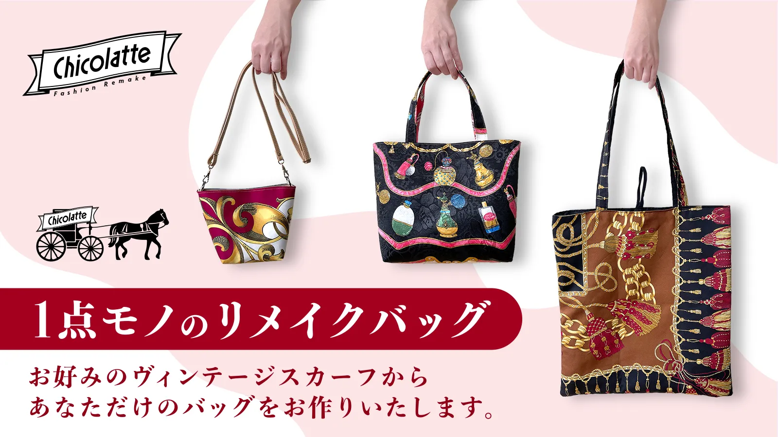 80年代ごろのヨーロッパのヴィンテージスカーフをリメイクして商品を作る<Chicolatte(チコラッテ)>から新作商品をMakuakeにて先行販売いたします。お好みのヴィンテージスカーフをお選びいただき、その素材からポシェットやトートバッグをお作りいたします。<Chicolatte>の商品は国内で生産しており身体にハンディキャップをお持ちの方々とともに商品を製作しております。彼らでなくてはできない集中力とプロ意識から生み出される商品をたくさんの方にも知って、触って、感じていただけるとうれしいです。