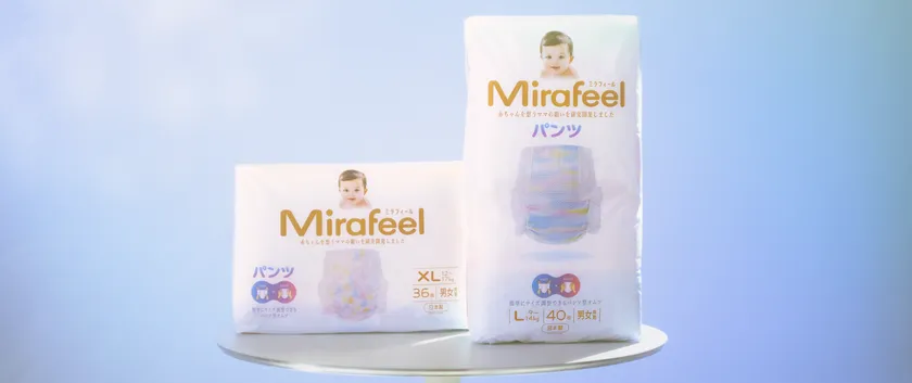 DSGジャパン株式会社は、世界初(当社調べ:前側での調整機能として)のサイズ調整可能な技術を採用した「Mirafeelシリーズ」5サイズを展開しております。Mirafeel(ミラフィール)は2020年12月1日より販売を開始したばかりの全く新しいパンツタイプ紙おむつで、絹の様な肌触りと、最薄にして最大量の吸水体を実現したこれまでにない最高の紙おむつとなっております。