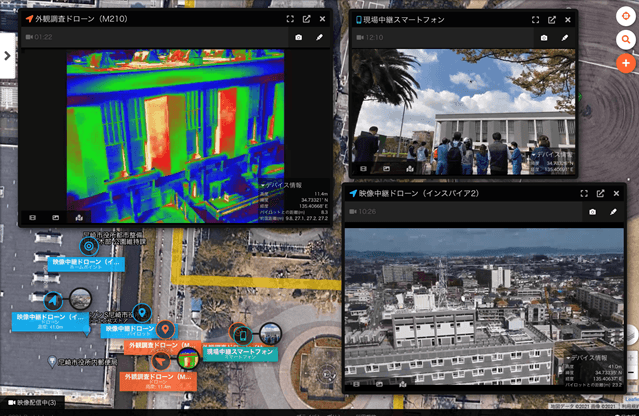 防災訓練では、リアルタイムでドローン等からの情報配信を可能にするシステム「Hec-Eye(ヘックアイ)」を活用し、ドローンやスマートフォンから取得される位置情報付のリアルタイム映像を対策本部へ共有することで迅速な被災状況把握を支援しました。