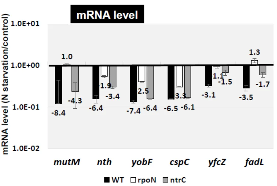 図2.RT-qPCR法を用いた、窒素飢餓による大腸菌野生株(黒)、rpoN欠損株(白)、ntrC欠損株(灰)における新規標的遺伝子群の発現レベルの観察結果。