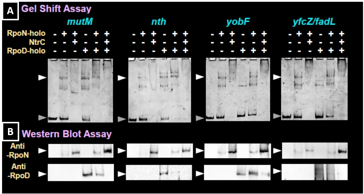 図3.RpoDホロ酵素に対するRpoNホロ酵素の拮抗阻害作用、および、NtrCの影響の観察。RpoNホロ酵素とRpoDホロ酵素の標的プロモーターへの結合を、ゲルシフトアッセイ(A)と、ウェスタンブロッティング(B)で観察した。