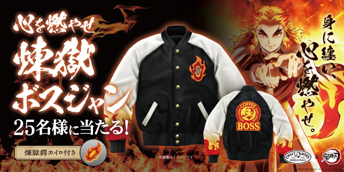 サントリー「クラフトボス」×鬼滅の刃CP第1弾。 初コラボ!「心を燃やせ煉獄ボスジャン」誕生。 身も心も熱くなれる!胸元の炎で“心を燃やせ”!