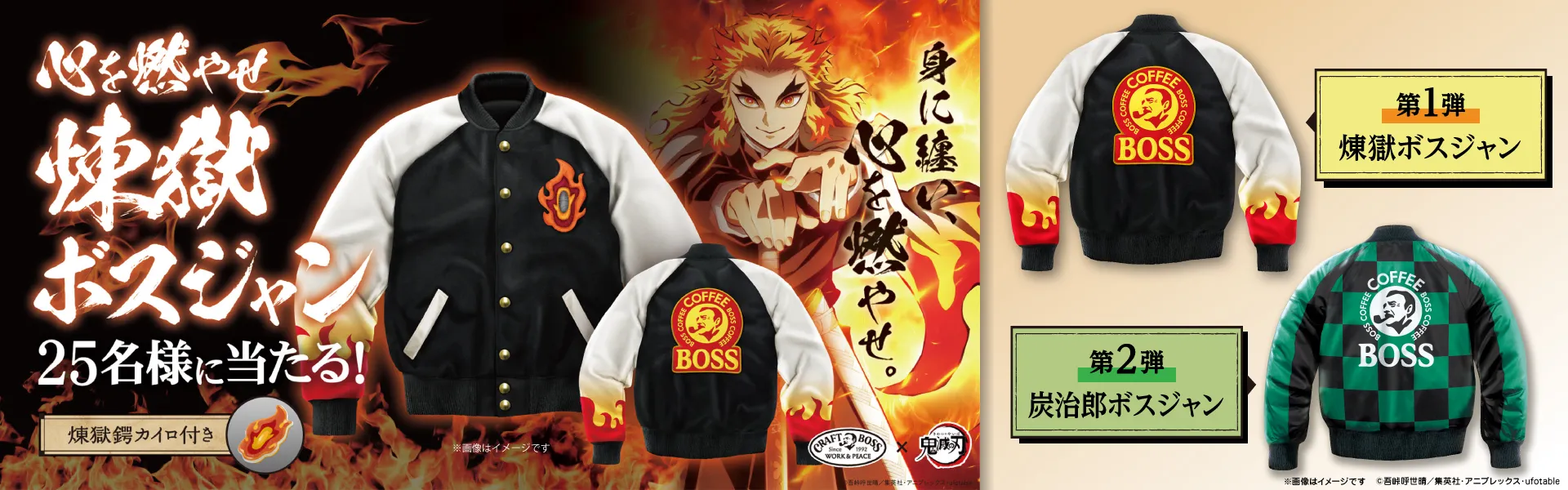 ■景品:「鬼滅の刃」コラボのオリジナル「心を燃やせ煉獄ボスジャン」
