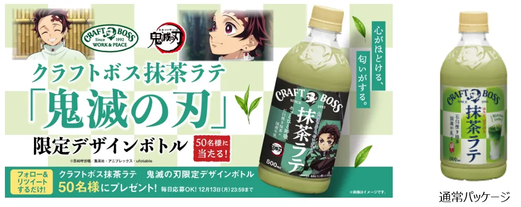 また、11月25日(木)からは第2弾として、対象商品の購入で50名様に「炭治郎ボスジャン」が当たるキャンペーンを実施します。さらに、12月6日(月)からは第3弾として、炭治郎の羽織柄の市松模様と共に日輪刀を構えた炭治郎がデザインされた、「クラフトボス抹茶ラテ 限定デザインボトル」プレゼントキャンペーンを実施します。