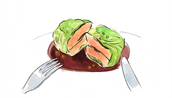 そして、フォアグラの厚み、焼き方、キャベツの茹で具合、色分け、包み方、ソースの煮詰め方まで極限の技術が求められます。