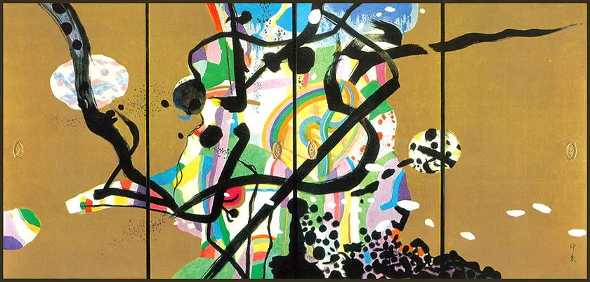 約60年にわたる画業のなかでも印象が多数制作したのが、寺院の障壁画です。印象は、1950年代半ばから日本画家による抽象表現という新たな創造に取り組み、その独自の表現は寺院空間においても遺憾なく発揮されました。