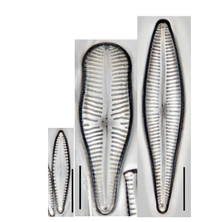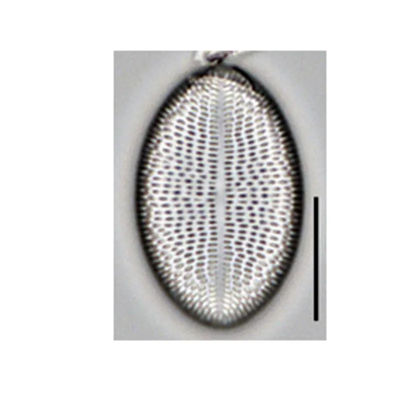 図2. Cocconeis lineata 和名はコメツブケイソウ。好清水性でアルカリ性の水域に出現します。付着力が強く、河川などでは植物の表面などに付着しています。(Scale bars:10μm)