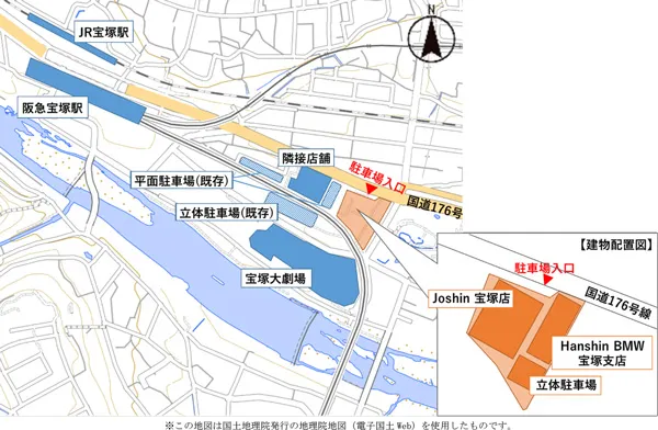 阪急電鉄株式会社(本社:大阪市北区、社長:杉山健博)と阪急阪神不動産株式会社(本社:大阪市北区、社長:諸冨隆一(※1))では、宝塚大劇場北側の国道176号線沿いに商業施設を開発し、今般、家電量販店「Joshin宝塚店」が11月26日(金)に、カーディーラー「Hanshin BMW宝塚支店」が12月16日(木)にそれぞれオープンすることとなりましたので、お知らせします。