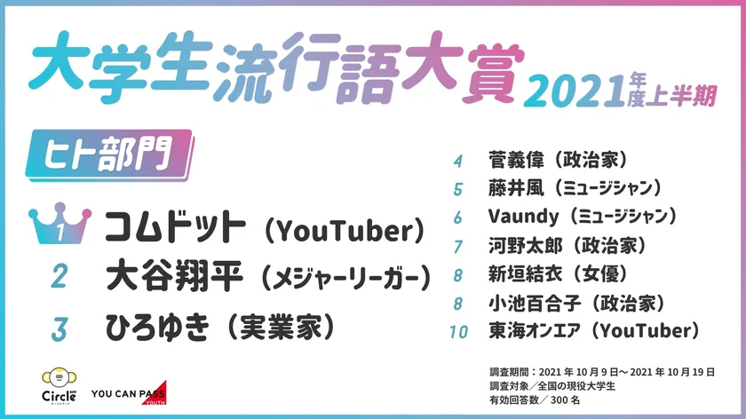 2021年度上半期の大学生流行語調査では、YouTuberに関連したワードのランクインが多く見られました。特に大学生に人気のYouTuberとは同年代ゆえにノリや雰囲気に共感できる部分があるのではないでしょうか。