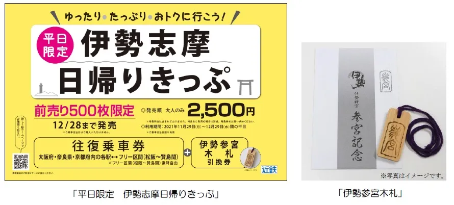 「平日限定 伊勢志摩日帰りきっぷ」は、大人2,500円で大阪・奈良・京都の3府県内の各駅~フリー区間(松阪駅~賢島駅間)の往復乗車券と、「伊勢参宮木札」の引換券がセットになったお得なきっぷです。