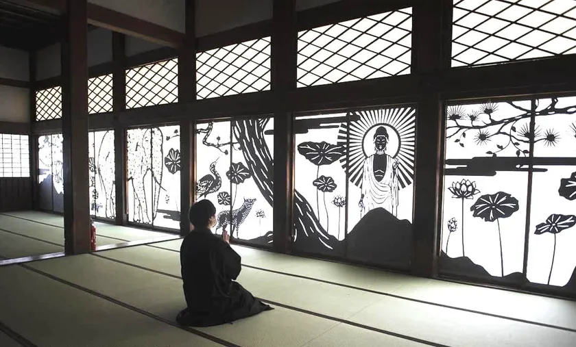 切り絵作家・早川鉄兵氏による18枚の切り絵障子が本堂内を飾り、特別な空間を演出し皆様をお迎えします。大通寺本堂(阿弥陀堂)は、伏見城の遺構と伝えられ国の重要文化財です。