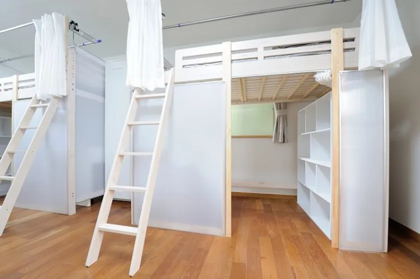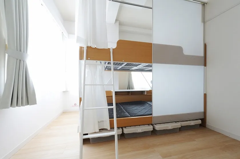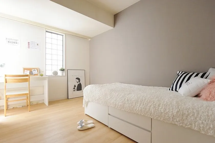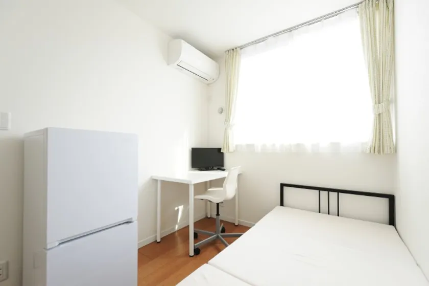 特徴 :シェアハウスの個室で、共有リビングがあります。リビングには、