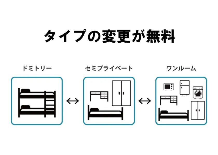 また、部屋の移動だけでなく、部屋タイプの変更(移動)も無料で行えます。部屋タイプのラインナップは、シェアドアパートメント、シェアハウス(個室、セミプライベート、ドミトリー)、家具付きワンルームになっております。
