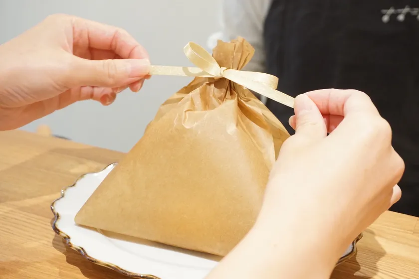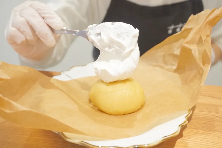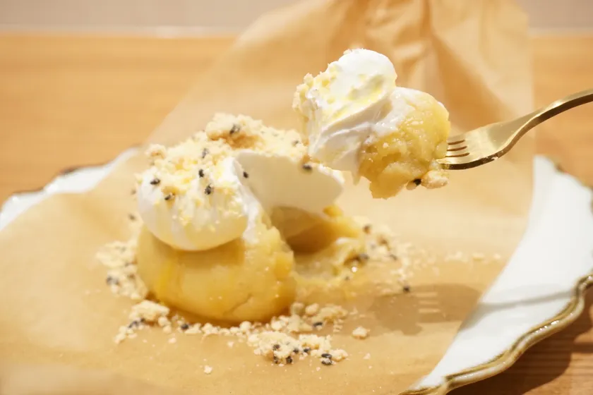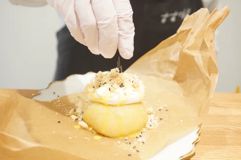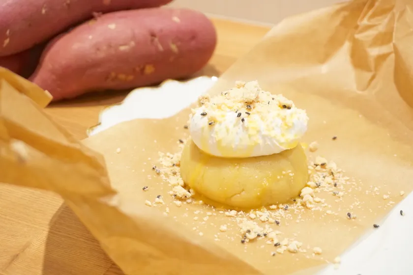 注文を受けてからオーブンで10分焼き上げ、最後にお客様の前で仕上げを行います。クラフトペーパーで包まれたシルクスイートポテトはプレゼントを開けるような感覚でリボンをほどいて頂き、仕上げに少し酸味のあるクリームと卵黄ソース、胡麻のクランブルを目の前で載せていきます。焼き立てのスイートポテトと冷たいクリームの温度差、しっとりとザクザクといった食感の変化を楽しめる新感覚なスイーツです。