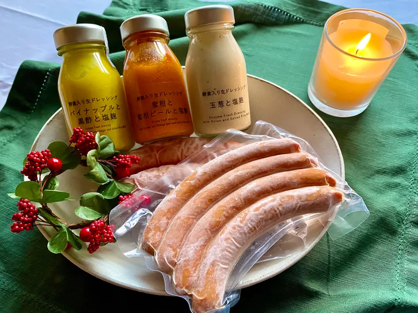 次世代漬け物「10%Iam」より、2021年<宝牧場のソーセージ入り クリスマスギフトセット>の期間限定販売のお知らせです。牛のミルクを与えて育てられた「みるく豚」の旨みが凝縮された人気ソーセージ2種類と10%Iamの人気酵素ドレッシング3種類を詰め合わせました。