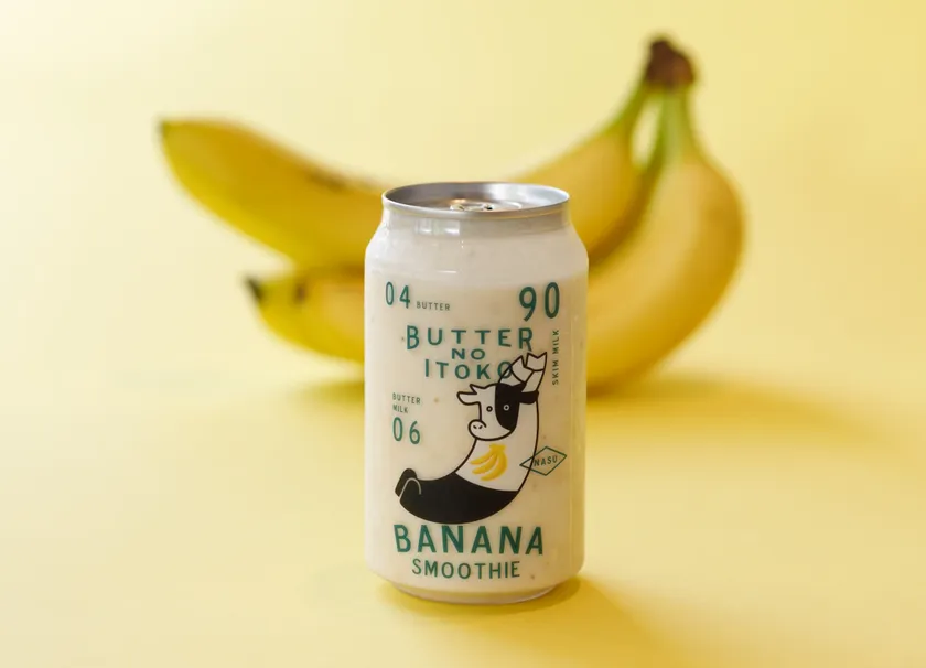 「バターのいとこ」監修の新コラボスムージー。バターを作る過程で生まれる90%の無脂肪乳、スキムミルクから作られていて、商品名の90は、そのスキムミルクの割合のことを表しています。森林ノ牧場で採れたスキムミルクを使用し、バナナは有機質肥料を使用して育てられた「田辺農園バナナ(南米エクアドル産)」を丸々1本使用したアップサイクルドリンクです。